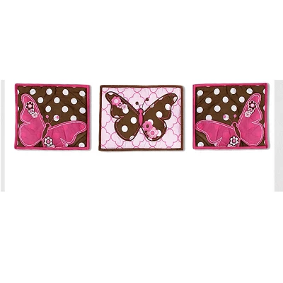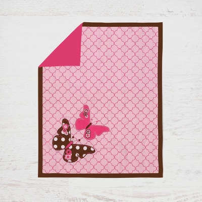 - This Bacati 10-piece Crib Set Includes Reversible Comforter/Playmat (33 x 43 inches), Two Crib fitted sheets (52 x 28 x 6 inches), Crib Skirt/Dust ruffle (13 inch drop) Diaper Stacker (holds more than 30 newborn diapers), Window Valance (15 h x 56 w inches with 1.75 inch Rod Pocket), 3 pc Wall Hangings Set and Musical Mobile in fun, colorful and signature prints in 100 percent cotton 200 Thread Count percale fabrics. Designed in United States by Experienced Designers. Many coordinating items available to purchase separately in this Bacati Buttefly Pink Chocolate Bedding Collection.