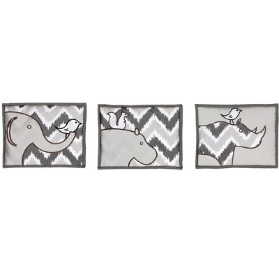- 10 pc Crib Set with 3 wall hangings and 4 Swaddle Blankets: Cotton Percale Reversible Comforter/Play Mat, Four Muslin Cotton Swaddle Blankets, Cotton Percale Fitted Crib Sheet, Cotton Percale Crib Skirt/Bed Ruffle, and 3 pc embroidered wall hangings.