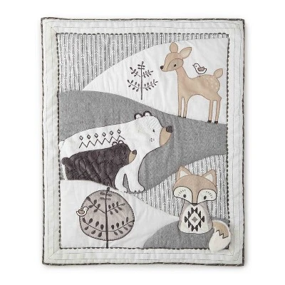 The Bailey Nursery Collection is inspired by sweet woodland friends including baby bears, fox cubs and adorable fawns. The 5 Piece Crib Bedding Set includes a Quilt, Fitted Sheet, Diaper Stacker, Wall Decal & Skirt/Dust Ruffle. The quilt features appliqued and embroidered animals and trees, with one fitted sheet matching with the design of the quilt, and the other with tribal patterned, tasselled bed skirt. Adding fun, adventurous accents, this desgin will transform your child’s room!