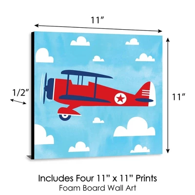 Taking Flight – Airplane Wall Art Set INCLUDES 4 ready-to-hang vintage airplane themed panels and non-marking wall mounts for easy hanging. Taking Flight – Airplane artwork is perfect for home decor. Taking Flight – Airplane Kids Room, Nursery Decor and Home Decor SIZE each 10 inches high x 7.5 inches wide x .5 inches thick. Jet airplane lightweight art prints will arrive ready to use – no frame needed. The black edge gives each print a modern, finished look. EASY TO HANG: Simply attach a non-marking wall mount (included) to each corner of a Taking Flight – Airplane art panel and press to hang in desired location. Wall mounts are repositionable, so you can redesign your artwork display at any time. PREMIUM HOME DECOR: 4-piece Taking Flight – Airplane Wall Art Set is professionally printed on thick material with a black edge. You will not need to frame this set of red airplane room decor. Each standout print is ready to hang and will add a contemporary touch to any room. MADE IN THE USA: Taking Flight – Airplane Room Decor is designed and manufactured at our Wisconsin facility using materials that are Made in the USA.