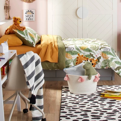Add fresh botanical flair to their sleeping nook with this Botanical Garden Cotton Comforter Set from Pillowfort™. This bedding set includes a cozy comforter and matching sham(s) for coordinated flair. Each of the pieces features a green and yellow leaf print over a white base for an eye-catching botanical-themed look. The 100% cotton fabric offers soft and comfortable year-round use, while the cozy comforter with fill adds a layer of warmth to the top of their bed. Add coordinating sheets and other bedding pieces to complete their bedding ensemble, and machine wash for easy care.