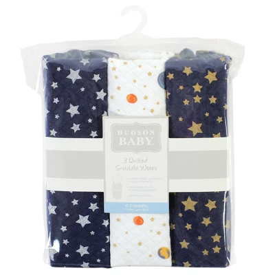 Hudson Baby quilted cotton swaddle wraps are the perfect swaddles to keep your baby comfortable, cozy and snug through the night. Our swaddles feature hook and loop closures for arms to be swaddled snug to body so baby feels safe and secure at night. Swaddle wrap provides a safe sleep environment. Never use swaddle when baby can roll over.