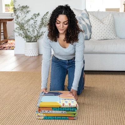 Your baby will love this soft, yet grippy-in-a-good-way foam mat that gives a bit of cushion while creating a perfect spot for learning new skills like rolling, army crawling, sitting and more. Unique pop-up sides help keep roll-away toys from escaping and double-sided boho-inspired print helps keep it visually fun for baby and considerate for parents. The compact, light fold & go design makes it easy to store away, move from room-to-room or take on-the-go. Folds compactly (57.8″ by 57.8″ open to 11.5″ by 19.3″ closed) for room-to-room, on-the-go & storage.