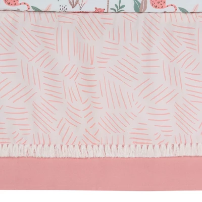 Create the purr-fect Enchanted Safari theme with this amazing jungle collection. The three-piece crib bedding set includes one quilt, one breathable 100% cotton fitted crib sheet, and one crib skirt. The quilt is on a soft pink cotton twill and includes an appliqued leopard, mommy and baby lemurs, a toucan, large trees, butterflies, and flowers all expertly appliqued and embroidered. The breathable 100% cotton fitted crib sheet is on a crisp white ground with leopards, lemurs, butterflies, trees, and flowers. There is elastic all the way around ensuring a safe and secure fit on a standard size crib mattress measuring 28” x 52”. The crib skirt adds the finishing touch to your child’s crib. The upper panel is on a pale pink ground with small, tossed stripes. The lower panel is a solid peachy pink twill with white fringe in between. It has a 14 ½” drop.