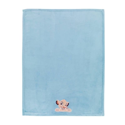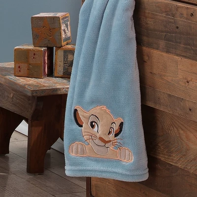 Simba in a soft minky two toned fur is centered at the bottom of the blanket resting his head on his front paws. This cozy blue blanket is 30” x 40” and is perfect for cuddling your little one. Makes a great baby shower or welcome home baby gift. Coordinates with the Baby Bedding Lion King Adventure Nursery Collection.