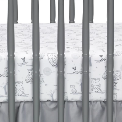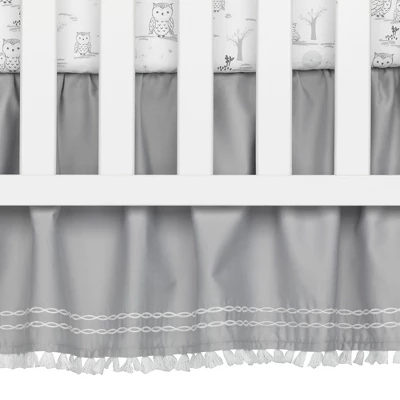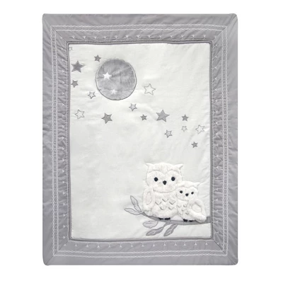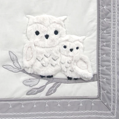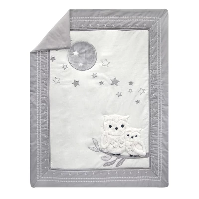 This four-piece nursery baby crib bedding set includes one quilt, one 100% cotton fitted crib sheet, one sateen crib dust ruffle and one appliqued snuggle sleeper (wearable blanket). The quilt features Luna, the mommy owl sitting proudly on her favorite branch with her baby owlet named Opal. The center panel on the quilt is a lovely white luxury linen blend. These sweet little owls are made in a very soft shaggy fur with silver embroidery on their tummies. A gray velour moon shines overhead amongst twinkling stars. The sateen border is decorated with an intricate chain stitch and a tassel pattern embroidery. The 100% cotton fitted crib sheet has elastic all around for a safe and secure fit and features Luna and her baby along with trees, moon, and stars. Fits a standard size crib (28” x 52”). White tassels trim the front of the shirred sateen dust ruffle complimented by a lovely chain stitch embroidery. Included in this baby bedding set is a snuggle sleeper (baby wearable blanket) which is recommended for safe sleep. It is made of 100% cotton in heather gray with an appliqued moon and stars. It is a size small, 27” in length and fits the 10 to 18 pound range or from birth to 6 months. Imported.