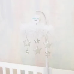 Your little one is sure to sleep tight with this adorable baby bedding collection by NoJo! This sweet baby blanket features a white ground with tossed moons, stars, and bears. Made of super soft plush fabrics, this blanket is great for on the go or at home! Reverses to a super soft white sherpa and measures 30″ x 40″.