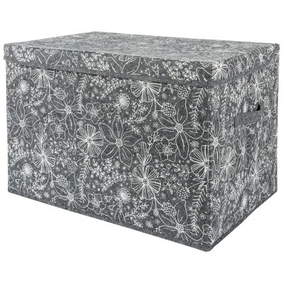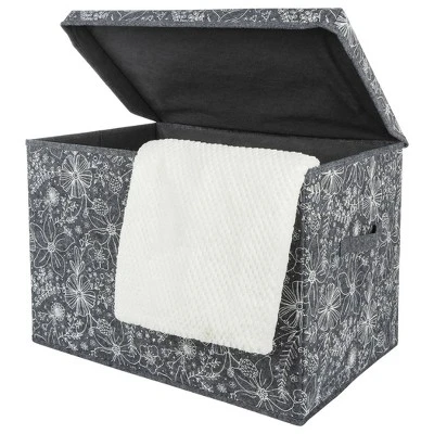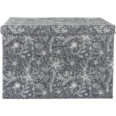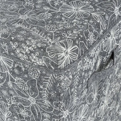 Our Floral Felt Toy Box is a great multi-purpose storage piece for any living space. Stash toys, books, blankets, clothes and keepsakes in this bin. The attached hinged lid features a tailored fold-over finish that brings an elevated elegance to this everyday storage bin. The toy box features a white printed floral design on the exterior and a solid gray inner lining. Coordinating accessories and room décor by Sammy and Lou are available and sold separately.