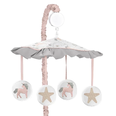 Unicorn Musical Crib Mobile will help complete the look of your Sweet Jojo Designs nursery. Lull your little one to sleep in style with this beautiful wind-up mobile that plays Brahms Lullaby (Cradle Song). Full Musical Mobile Set Includes: Plastic mobile frame with music box, Plastic clamp (fits standard rails), Fabric canopy with hanging toys and Arm sleeve cover. Coordinates beautifully with the Sweet Jojo Designs matching crib set.