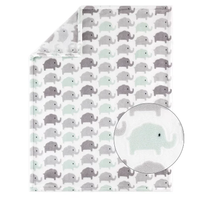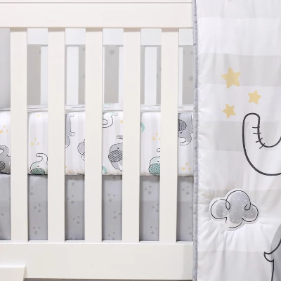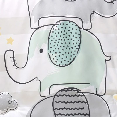 A stack of playful elephants stands tall in this 5-piece Elephant Dream baby bedding set from The Peanutshell. Our generously sized 32″ x 41″ soft and cozy quilt features a trio of gray and aqua elephant friends a top a wide light gray stripe and surrounded by a sky of moons, clouds, and stars. The quilt is finished in a gray border. The tossed character fitted crib sheet comes in a perfect universal fit, designed for a standard 28″ x 52″ crib mattress with snug fitting all around elastic. A second fitted sheet print features a linear layout of parading elephants and rows of yellow stars. The tonal gray star printed bed skirt rounds out this gender-neutral look. The 30″ x 40″ burnout velour blanket with gray and aqua elephant silhouettes is the perfect accessory for stroller walks or comfy cuddles.