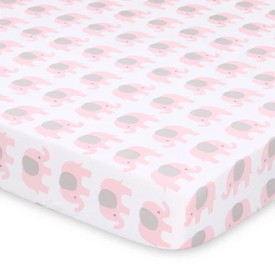 Pink elephants lead the way to dreamtime with this Elephant themed 2pk playard sheet set from The Peanutshell. Set of two makes for quick and easy changes, with simple machine wash/tumble dry care. One pattern is rows of playful pachyderms marching along; the other is loving hearts made up from tiny polka dots in a sweet all-over design. Pink elephants on a crisp white ground and hearts in shades of pink and gray on a soft pink ground are sure to surround baby with love as she goes off to dreamland.