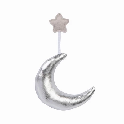 Encourage eye tracking and sound perception skills with this Celestial Space Mobile by Trend Lab. The banded mobile ring features a simple soft blue solid. Felt planets, stars, and crescent moon in shades of grays and blues are suspended from decorative white ribbon and slowly rotate to Brahms’ Lullaby. Crib Mobile fits standard crib rail up to 5 inches and measures approximately 24 in tall by 20 in wide when fully assembled.