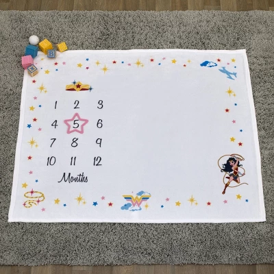 The Wonder Woman Milestone Blanket is perfect for your little superhero! Made with super soft snuggly fabrics to keep baby comfy! Featuring a white ground with the lasso of truth, stars and clouds! This blanket is designed to create the perfect photo opportunity by capturing baby’s milestones and special moments. Measures 40″ x 50″. Machine washable for easy care!